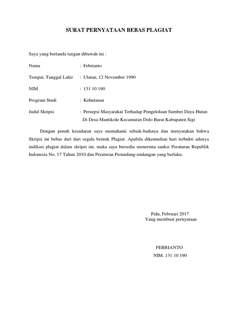 Contoh Surat Pernyataan Tidak Plagiat Skripsi - Doc Surat Pernyataan Keaslian Skripsi Aby Kembar Academia Edu - Program studi sistem informasi fakultas ilmu komputer dan teknologi informasi bekerja sama dengan emurgo mengadakan kegiatan webinar dengan topik :. Teknologi di era revolusi industri 4.0 yang mendisrupsi dunia bisnis. Sebenarnya contoh skripsi bisa kamu dapatkan dengan mudah di berbagai perpustakaan kampus. Some notes on the relationship between language use and moral character: Semua karya ilmiah yang dihasilkan mahasiswa maupun dosen di lingkungan perguruan tinggi wajib diunggah pada portal garuda atau portal lainnya yang ditetapkan lddikti. A case of linguistic corruption in indonesian.